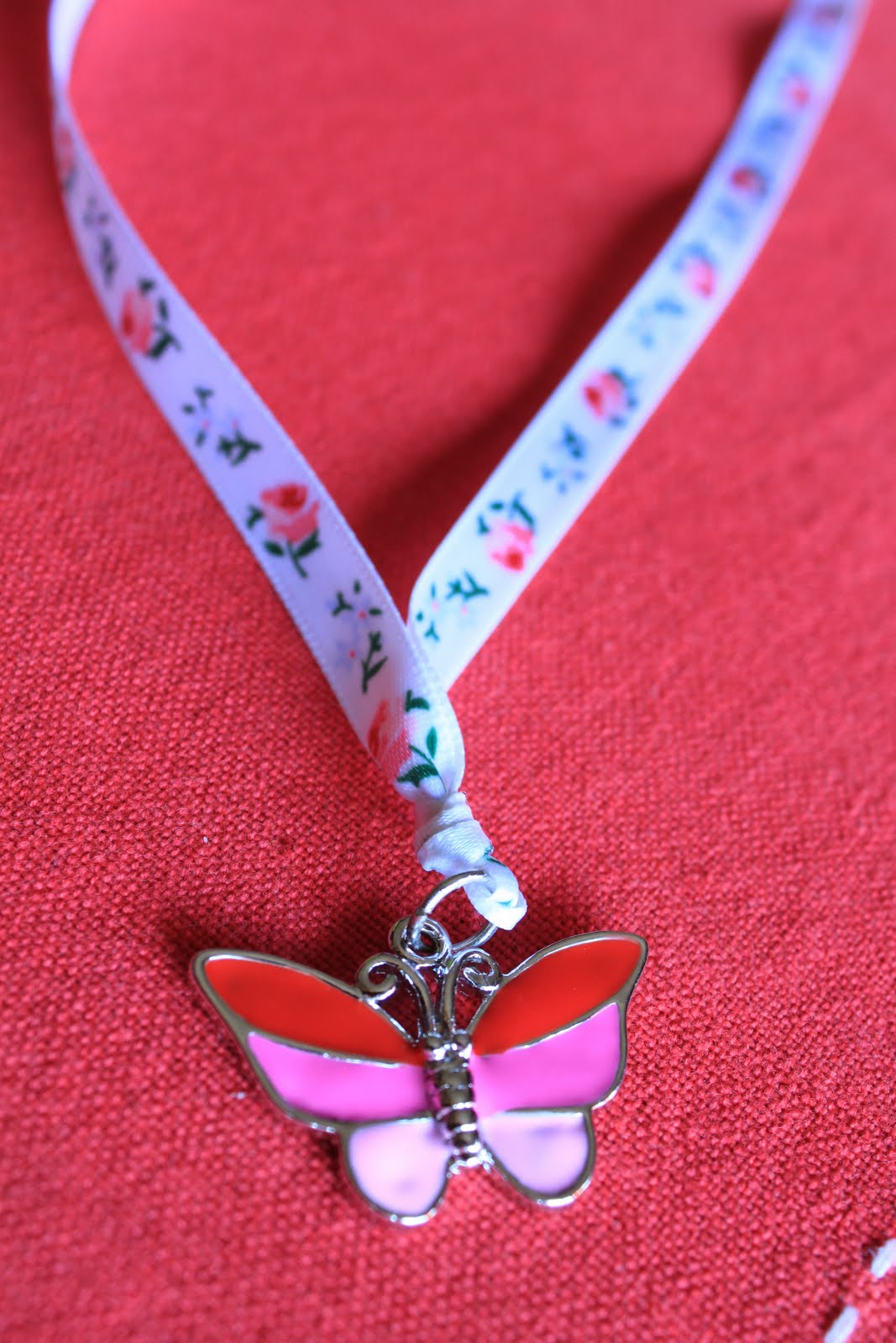 #463 Colar com borboleta rosa e fita de cetim com motivos florais - 5 missangas